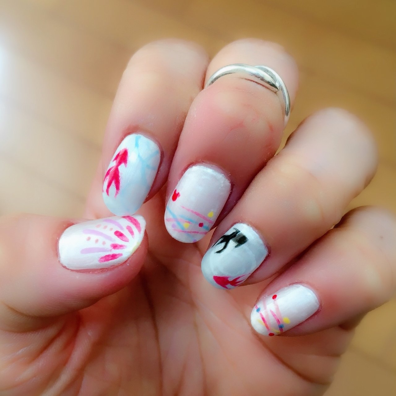 夏祭りネイル 花火リベンジ ㅤㅤㅤㅤㅤㅤㅤㅤㅤㅤㅤㅤㅤ 金魚の水面が全然わからん 写真が思うように撮れなくて汗かいた 金魚すくいネイル 夏祭りネイル 夏ネイル 夏ネイル17 セルフネイル 花火ネイル 花火大会ネイル 朝顔ネイル あさがお